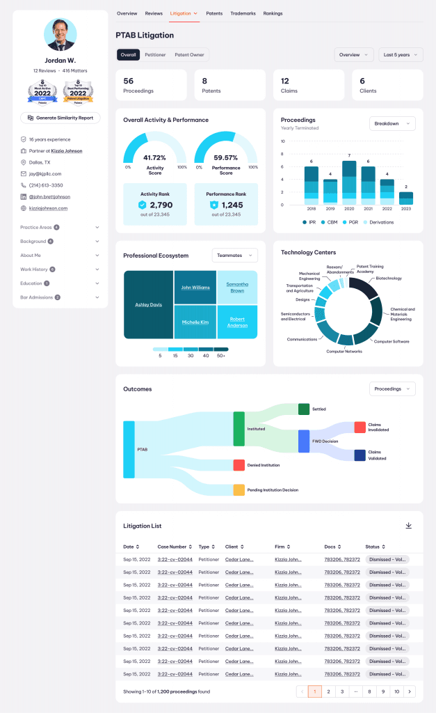 IPR, PGR, and CBM cases—track petitioners, outcomes, appeal ratios, and attorney performance.
